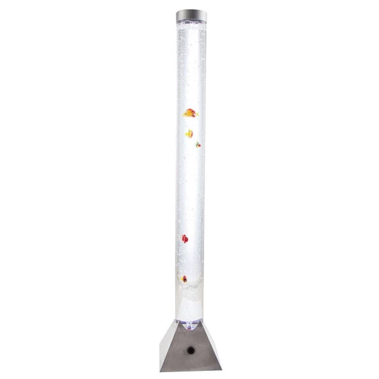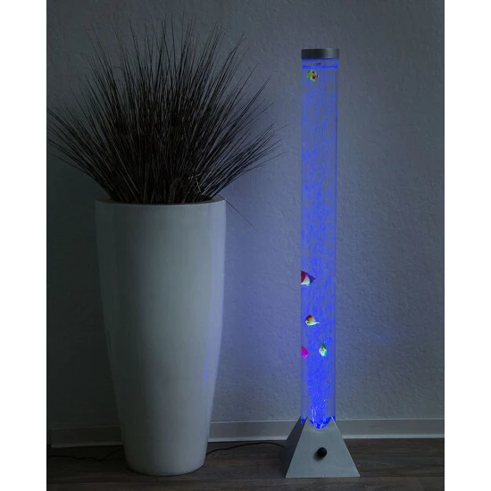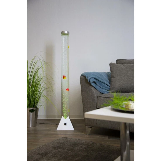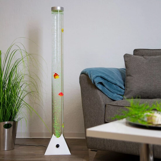 Die Stehlampe Aqua überzeugt mit spannendem Farbwechsel und kleinen dekorativen Fischen, die vergnügt umherschwimmen. Sie kann durch einen Fußschalter ganz einfach bedient werden.