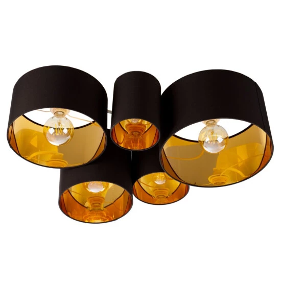 Diese 5-flammige Deckenleuchte überzeugt durch ihr stilvolles Design und sorgt mit ihrem warmen Licht für eine entsprechend angenehme Wohlfühl-Atmosphäre. Die Deckenleuchte hat fünf matt-schwarze Stoffschirme, die sich in ihrer Größe unterscheiden und innen mit einer glänzenden Goldfolie ausgelegt sind. Durch die goldenen Schirminnenseiten wird das Licht der Leuchtmittel entsprechend reflektiert und sorgt somit im gesamten Raum für eine warme und behagliche Atmosphäre sobald die Leuchte eingeschaltet wird. Insgesamt verleiht die trendige Kombination aus Schwarz und Gold der Leuchte einen ausgesprochen edlen Charakter und eignet sich besonders gut für moderne Einrichtungsstile.