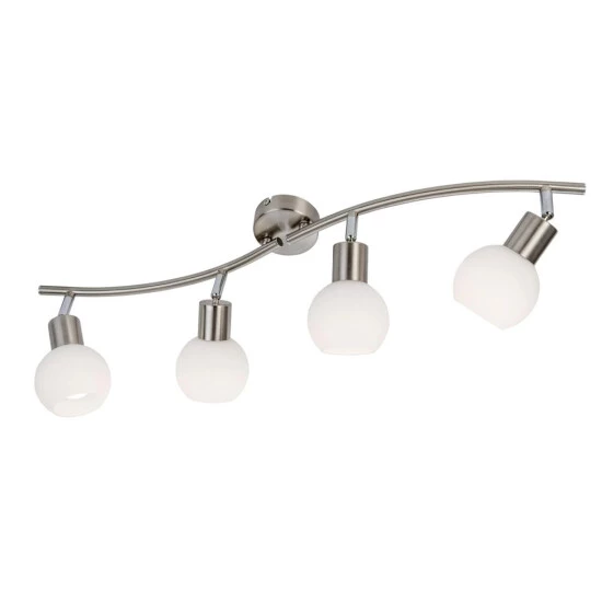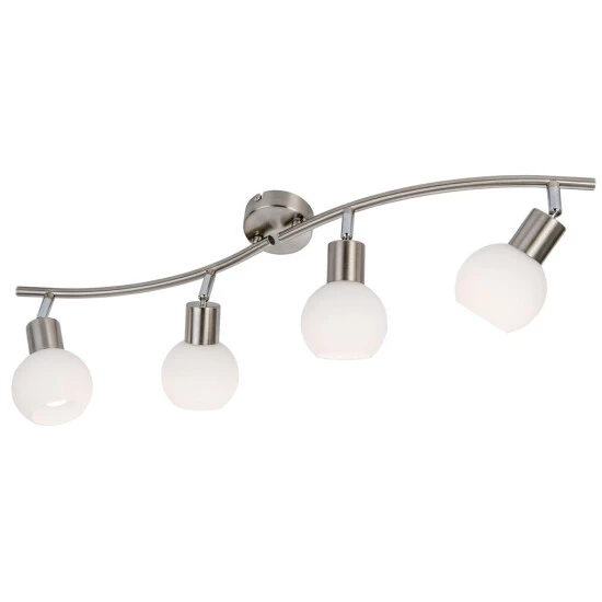 Mit vier schlichten weißen Opalglasschirmen und einem Gestell aus Nickel, die moderne LED-Deckenleuchte Loxy. Ausgestattet mit vier kugelförmigen, schwenkbaren Schirmen, deren Licht jeden Winkel des Raumes ausleuchten wird. Unser beinhaltet die Leuchtmittel 4 x E14,3 W, LED, Energieeffizienz A++.