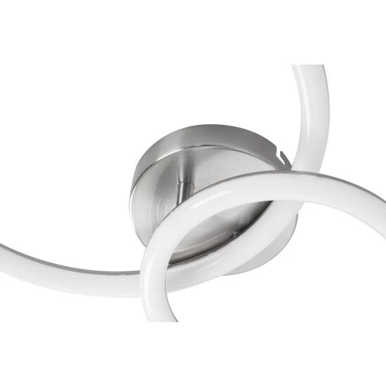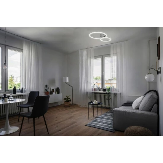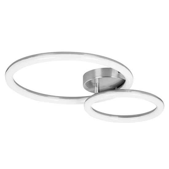 Die Deckenleuchte besteht aus zwei unterschiedlich großen Leuchtringen aus Kunststoff und Metall und ist ein Blickfang im modern eingerichteten Wohnzimmer. Die Leuchte gibt ein warmweißes Licht und ist perfekt für Wohnräume aber auch für Büroräume geeignet.
