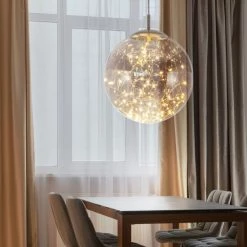 Das Design mit der Lichterkette im Inneren ist ein wahrer Blickfang. Besonders gut kommt die Hängeleuchte über dem Wohn- oder Esszimmertisch zur Geltung.