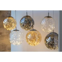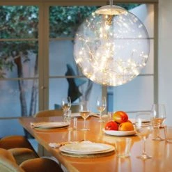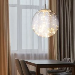 Diese Hängeleuchte ist ein echter Hingucker. Ihre Lichterkette im Inneren des Glasschirms zaubert ein stimmungsvolles Licht in den Wohnraum, die besondere Optik schmückt gleichzeitig die Decke. Über dem Wohn- oder Esszimmertisch kommt die Hängeleuchte besonders gut zur Geltung.