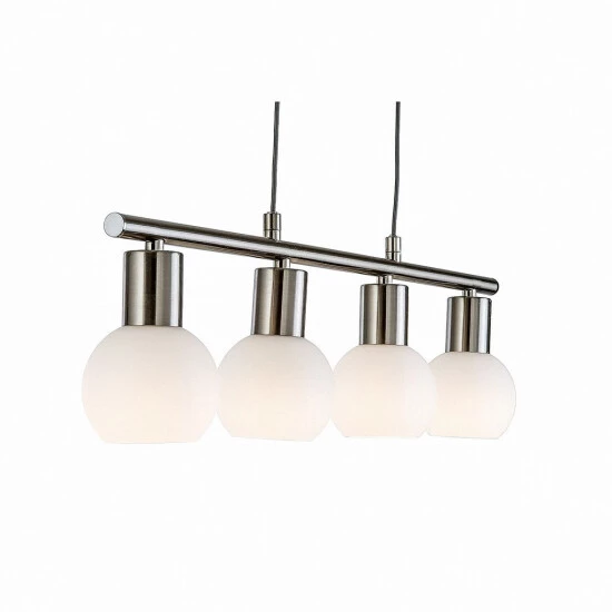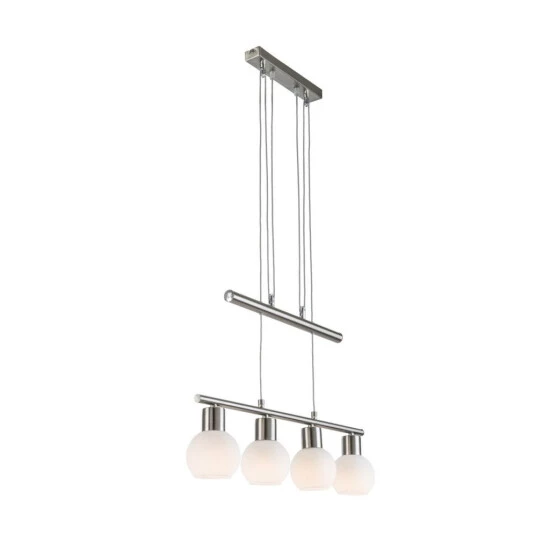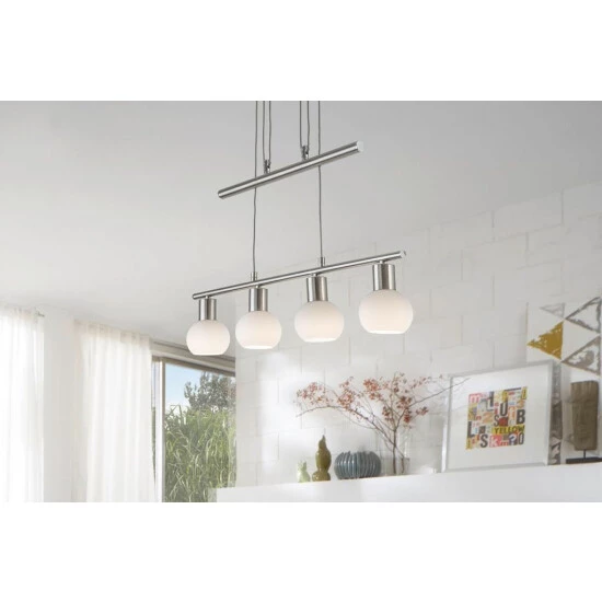 Wunderschöne und praktische Balkenleuchte Loxy, 4-flg. mit vier kugelrunden Lampenschirmen aus mattweißem Opalglas.