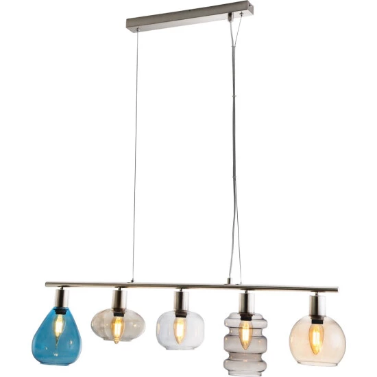 Pesaro, die attraktive und moderne Pendelleuchte ist ein Highlight in Ihrem Zuhause. Modern aus Metall, mit unterschiedlichen Farben und Gläsern der Leuchtenschirme begeistert sie einfach. Die 5-flammige Leuchte sorgt für stimmungsvolle Beleuchtung in Ihrem Wohnbereich. In der Höhe verstellbar eignet sie sich optimal über einem Esstisch. So können Sie in angenehmer Atmosphäre und geselliger Runde die Zeit verbringen. Produktdetails: Pendel 5-flammig Nickel Matt unterschiedliche Gläser in unterschiedlichen Farben Farben der Gläser: Blau, Amber, Rauchgrau und Klar höhenverstellbar schaltbar über Wandschalter nicht für den Nassraum geeignet ca. Maße: Länge: 80 cm Höhe: max.150 cm Leuchtmittel inklusive: Nein – für 5x E14, max. 40Watt technische Details: Schutzklasse: 2 Lieferumfang: 1x Pendelleuchte-…