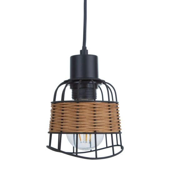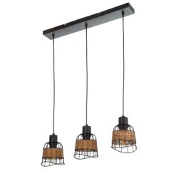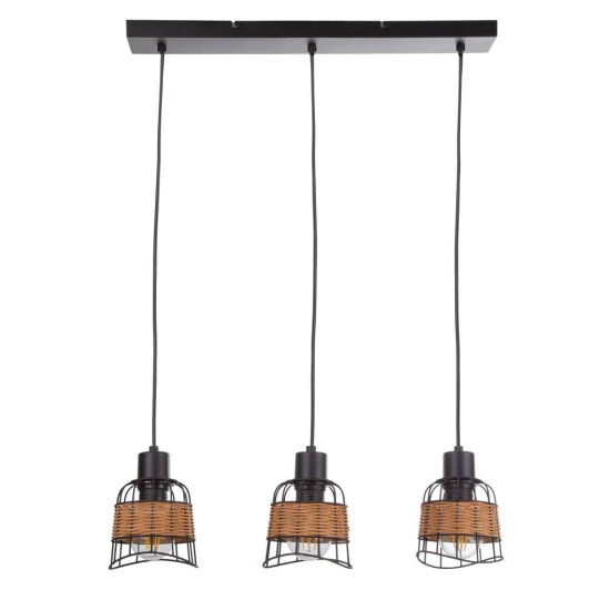 Diese 3-flammige Pendelleuchte im angesagten Käfig-Design besticht mit einem interessanten Materialmix aus Metall und Rattan und avanciert dadurch zum echten Hingucker in Ihrem Wohn- und Essbereich. In ihrer Basis weisen die Lampenschirme ein graziles Gestell aus schwarzen Metallstäben auf, wodurch die Schirme recht offen gestaltet sind und das Licht durch die zahlreichen Zwischenräume entsprechend hinausstrahlen kann. Auch nach unten hin sind die Schirme jeweils komplett offen, sodass beispielsweise ein Esstisch großzügig beleuchtet wird. Ein weiteres optisches Highlight bietet der wellenförmige Rand der jeweiligen Drahtschirme: Dieses kleine Details verleiht der Leuchte zusätzlich ihren aufregenden Look. Im mittleren Bereich ist durch die feinen Metallstäbe ein ringförmiges Geflecht aus Rattan eingearbeitet, durch dessen dezente Lücken vereinzelte Lichtstrahlen hindurchschimmern und so interessante Licht- und Schaffeneffekte in der Umgebung entstehen lassen. Darüber hinaus ist jeder der drei Drahtschirme einzeln mit der Deckenhalterung verbunden und kann in der Weise seiner Abhängung individuell eingestellt werden: So lassen sich die Lampenschirme entweder auf unterschiedlicher Höhe oder aber auch alle gleich hoch ausrichten.
