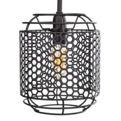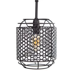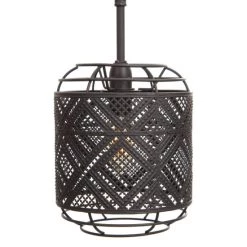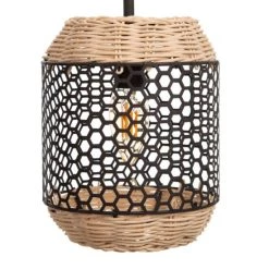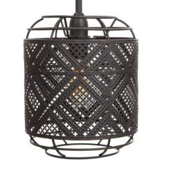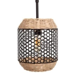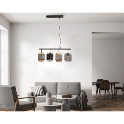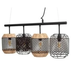 Diese 4-flammige Pendelleuchte überzeugt durch das stilvolle Design aus schwarzem Metall. Die vier einzelnen Lichtquellen haben jeweils unterschiedlich gearbeitete Schirme aus Metall und Korbgeflecht, die vor allem im eingeschalteten Zustand zum optischen Highlight werden. Die unterschiedlichen Ausstanzmuster und eingearbeiteten Materialien der Schirme sorgen für ein sehr schönes Licht- und Schattenspiel in der Umgebung.