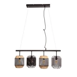 Diese 4-flammige Pendelleuchte überzeugt durch das stilvolle Design aus schwarzem Metall. Die vier einzelnen Lichtquellen haben jeweils unterschiedlich gearbeitete Schirme aus Metall und Korbgeflecht, die vor allem im eingeschalteten Zustand zum optischen Highlight werden. Die unterschiedlichen Ausstanzmuster und eingearbeiteten Materialien der Schirme sorgen für ein sehr schönes Licht- und Schattenspiel in der Umgebung.