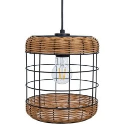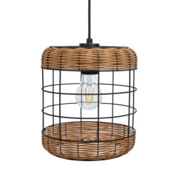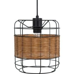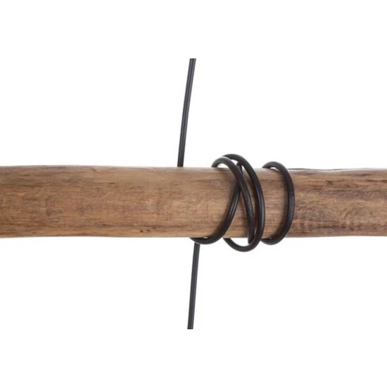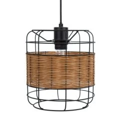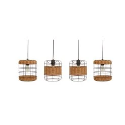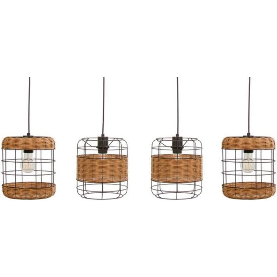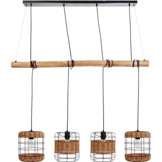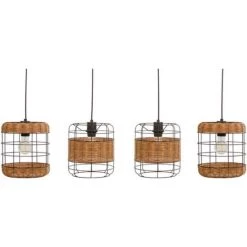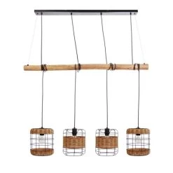 Diese 4-flammige Pendelleuchte mit natürlichem Charme eignet sich ideal für naturverbundene Raumkonzepte. Die vier Leucht-Elemente sind an einem schmalen Holzbalken aus Eukalyptusholz befestigt, wobei sich die Abhängung der Schirme frei wählen lässt: So können diese entweder auf unterschiedlicher Höhe oder aber auch alle gleich hoch ausgerichtet werden. Die Kabel werden hierzu einfach um den Balken geschlungen, was der Leuchte einen entsprechend unkonventionellen Look verleiht. Die einzelnen Lampenschirme weisen in ihrer Basis ein graziles Gittergestell aus schwarzen Metallstäben auf, wodurch die Schirme recht offen gestaltet sind und das Licht durch die zahlreichen Lücken entsprechend austreten kann. Als zusätzliches optisches Highlight unterscheiden sich die beiden äußeren Leuchtelemente von den beiden Inneren in der Anordnung des eingearbeiteten Rattangeflechts: Entweder wurde das Rattan mitting als Ring durch die feinen Metallstäbe gestaltet oder im oberen und unteren Bereich des Schirms, sodass eine freie Sicht auf die Leuchtelemente geboten wird.