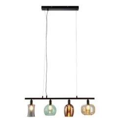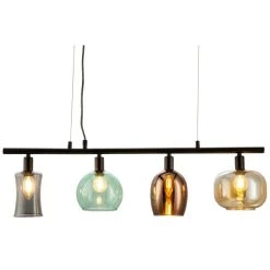 Produktdetails: Material: Metall und Glas Farbe Metall: Matt Schwarz Farbe Glas: Rauchgrau, Amber, Kupfer, Grün nicht für den Nassraum geeignet ca. Maße: Länge: 80cm Höhe max: 150cm Leuchtmittel inklusive: nein – für 4x E14, max. 40 Watt technische Details: Fassung: E14 Lieferumfang: 1x Pendelleuchte Telesto – Rauchglas bunt Eventuell abgebildete Dekorationsartikel, Beleuchtungen, HiFi-Geräte oder ähnliches sind nicht im Lieferumfang enthalten.
