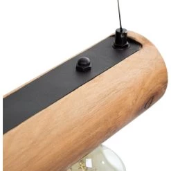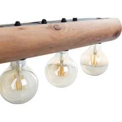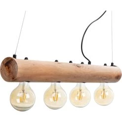 Diese 4-flammige Pendelleuchte bietet optisch die perfekte Kombination aus natürlichem und modernem Design. Zum absoluten Hingucker wird hierbei der Holzbalken aus naturbelassenem Eukalyptusholz, der diese Leuchte zu einem hochwertigen und gleichzeitig einzigartigen Einrichtungsobjekt macht. Praktischerweise sind in dem Holzbalken bereits vier E27-Fassungen integriert, die individuell mit den gewünschten Leuchtmitteln bestückt werden können: Beispielsweise können hier Filamentlampen in Globeform eingesetzt werden, oder auch jeweils unterschiedlich geformten Leuchtmittel, wodurch diese Leuchte noch individueller gestaltet werden kann. Die Deckenhalterung und die herabhängenden Streben aus schwarzem Metall runden das Design stilvoll ab. Die Leuchte eignet sich aufgrund ihrer Größe perfekt für die Beleuchtung eines Esstisches und wird für ein passendes Ambiente in Ihrem Esszimmer sorgen.