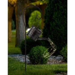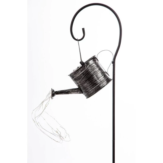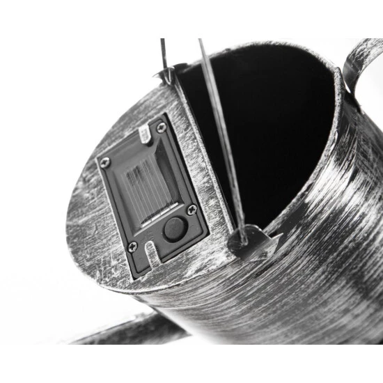 Bei der kleinen Gießkanne in verzinkter Optik kommen die Lichterketten mit LEDs direkt aus der Brause, sodass der Eindruck entsteht, die Kanne würde mit Licht gießen. Die Lichterketten sind batteriebetrieben und können entsprechend wieder aufgeladen werden. Durch das Solarmodul wird der integrierte Dämmerungssensor aktiviert und die Leuchte schaltet sich somit automatisch an, sobald es dunkel wird. Mithilfe des praktischen Erdspießes aus Metall ist die die Deko-Leuchte außerdem vielseitig platzierbar.