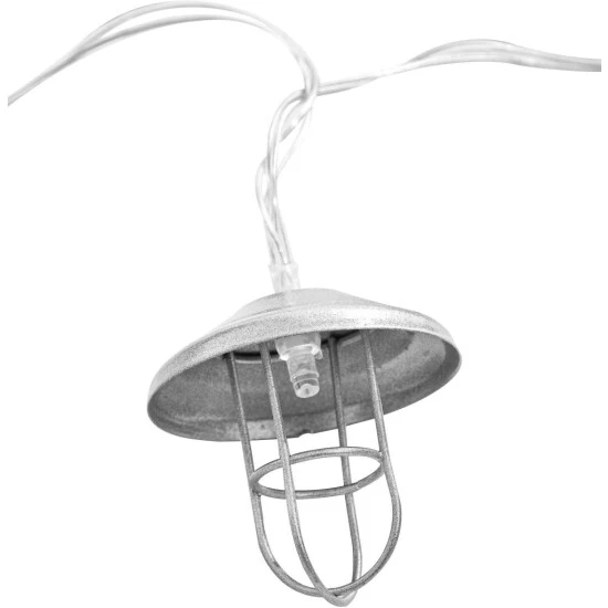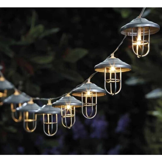 Diese solarbetriebene LED-Lichterkette besteht aus insgesamt 10 Lichtquellen in klassischer Laternenoptik und eignet sich ideal zur dekorativen Beleuchtung der Terrasse, des Gartens oder des Balkones. Die jeweiligen Laternen sind aus silberfarbenen Metall gearbeitet und recht offen gestaltet, sodass ein freier Blick auf das integrierte Leuchtmittel geboten wird und die Umgebung optimal beleuchtet werden kann durch dessen warmweißes Licht. Da sich die Lichterkette praktischerweise mithilfe von Sonnenenergie betreiben lässt, kann hierbei auf eine externe Stromquelle verzichtet werden. Das entsprechende Solarpanel kann mithilfe des integrierten Erdspießes einfach an gewünschter Stelle im Garten, im Beet oder auch in einem Blumenkübel platziert werden.