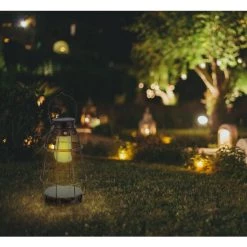Diese Außenlaterne besticht durch ihre nostalgische Optik und dient neben ihrer Funktion als Lichtspender ebenso als stilechtes Dekorationsobjekt. Die Oberfläche des Metallgitters wurde in einem Altsilber gestaltet, wodurch das Design authentisch abgerundet wird. Der offene Leuchtenschirm liefert einen freien Blick auf das integrierte Leuchtelement in passender Filamentoptik und lässt dessen Licht ungehindert in die Umgebung strahlen. Dank des praktischen Tragegriffs lässt sich die Solarleuchte außerdem jederzeit flexibel umplatzieren und dient an jeder gewünschten Stelle als zusätzliche Lichtquelle.