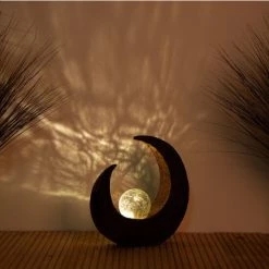 Diese Solarleuchte in Form eines Sichelmondes sorgt durch ihr Design für ein besonders verträumtes Ambiente in den Abendstunden. Die beleuchtete Glaskugel wird durch den schwarz-braunen Sichelmond kontrastreich in den Fokus gesetzt und damit zum absoluten Blickfang in Ihrem Outdoor-Bereich. Die integrierten LED-Lampe sorgt mit ihrem warm-weißen Licht für entsprechend stimmungsvolle Beleuchtung an Ort und Stelle. Dank des hochwertigen Solarmoduls kann die Solarleuchte ohne Stromanschluss verwendet werden und tankt tagsüber selbstständig Energie, um in der Nacht leuchten zu können.