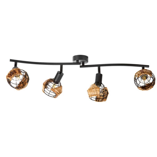 Dieser 4-flammige Deckenspot besticht neben der variablen Ausrichtung der Licht-Elemente vor allem durch die trendige Optik und fungiert somit zum absoluten Hingucker in Ihrem Wohnbereich. Das Gehäuse der jeweiligen Lampenschirme weist als Basis ein filigranes Gittermuster auf, wodurch das Licht entsprechend hinausstrahlen kann. Ein besonderes optisches Highlight bietet das teilweise eingearbeitete Grasgeflecht, was den wesentlichen Industrie-Look mit einer gewissen natürlichen Note abschließt. Somit lässt sich dieses Beleuchtungsobjekt optimal in sowohl moderne als auch in naturverbundene Raumkonzepte einfügen.